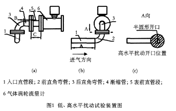 高水平擾動試驗裝置與低水平擾動試驗裝置總體管路結構相同,不同的是,高水平擾動試驗裝置在低水平擾動試驗裝置結構中的兩個直角彎管之間加了半圓形開口結構的墊片,即使該處的流通面積為該處管路橫截面積的一半,開口位于(沿氣體流動方向)*1個彎管的外側半徑處,如圖l(b)、(c)所示。