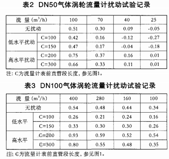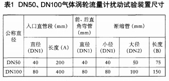 在大氣壓力條件下,借助于標準表法氣體流量標準裝置(以下簡稱標準裝置),對于丹東東發(fā)集團有限公司生產的系列小口徑氣體渦輪流量計,選擇DN50、DN100兩種口徑的流量計做擾動試驗,即分別測試流量計低、高水平的無擾動與擾動條件下的指示誤差,并進行比對、分析。
