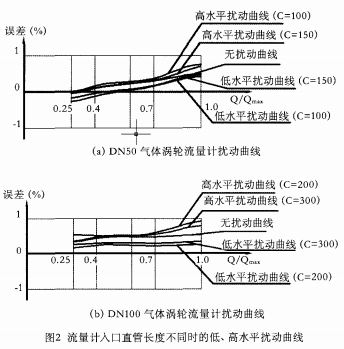 擾動試驗可以驗證氣體渦輪流量計抗干擾性能的好壞,在給定安裝條件下,擾動和非擾動條件下誤差相差越大,表的抗干擾性能就越差,壽命就會越短。按照prEN 12261的要求,在0.25Qmax~Qmax間,擾動和非擾動條件下的誤差變化應小于基本誤差限的1/3。丹東東發(fā)(集團)有限公司生產的氣體渦輪流量計在試驗流量范圍內的誤差限為±l%,當入口直管段長2DN(DN公稱直徑)時,擾動試驗前后的誤差變化即符合規(guī)定的要求。因此,該類流量計在安裝使用時,無論管道內流體的流動類型如何,只要入口直管段的長度達到2DN就可以了。