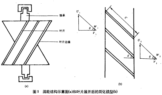 圖l(a)是常用渦輪流量計的結(jié)構(gòu)示意圖,葉片展開后的簡化模型如圖1(b)所示。沖擊葉片的局部混合密度為ρm;流體平均速度為U;入口線速度U1;入口相對于葉片的速度W1;入口速度為V1;葉片出口速度V2;出口線速度U2;出口相對于葉片的速度W2。因葉片流通面積為常數(shù),流入前后的壓力變化很小因此將油、氣、水混合物作為不可壓縮流體處理。公根據(jù)連續(xù)性原理,流入前后V1=V2,由此可以作出如圖l(b)所示的入、出口速度三角形。為使葉輪旋轉(zhuǎn),只有與圓周速度相同方向上的力才產(chǎn)生驅(qū)動力矩。根據(jù)動量原理,由流體動量變化在圓周方向上產(chǎn)生的驅(qū)動力F為