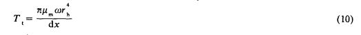 文獻認為流體在兩個葉片之間流動時,軸承外表面上的作用力與軸平行。實際上,流體是以一定角度通過葉片的,所產(chǎn)生的阻力矩不能忽略。采用與式(3)類似的動量方程,軸表面上的速度取x的四次冪分布(W=Cx4),可以得出Ta的表達式為