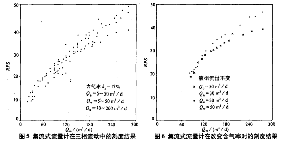 圖5是對斯倫貝謝公司的集流式流量計進行刻度的結(jié)果。實驗所用油、水的密度分別為0.825g/cm³和1g/cm³,用空氣模擬天然氣,油、水、氣的流量變化范圍,考慮了常見油氣水產(chǎn)量和含量的變化。從圖中可見,實驗數(shù)據(jù)的線性關(guān)系良好。圖6是液相流量不變,含氣率在10%~70%間變化時的刻度結(jié)果。在總流量(Qm)變化范圍為80~300m³/d時,油水比的變化對RPS-Q響應影響不明顯。因此,多相流動中確定總流量的可靠方法是采用集流式流量計。