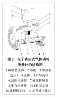 如圖2,電子表頭式的氣體渦輪流量計主要山殼體、整流器、渦輪、信號檢測器、溫度傳感器、壓力傳感器,LCD顯示屏體積修止(X)、潤滑油泵幾部分組成。