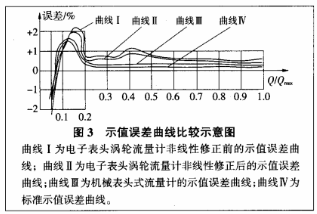 從專業(yè)技術(shù)角度來說,電子表頭式渦輪流量計一般由于無法有效降低儀表內(nèi)部阻力,不經(jīng)修正的示值誤差曲線多處(多段)超差,只有通過將儀表流量分為幾段采用不同的儀表系數(shù)進行非線性修正,才能使它達到合格示值誤差曲線的要求。機械表頭式渦輪流量計的示值誤差曲線完全由儀表的結(jié)構(gòu)設(shè)計技術(shù)水平、零部件制造水平、裝配工藝水平、整機測試水平來決定,不存在非線性修正的問題。示值誤差曲線比較如圖3所示。