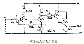 當(dāng)被測介質(zhì)(液體)通過變送器時,推動渦輪旋轉(zhuǎn),由于螺旋狀的渦輪是由導(dǎo)磁材料制成,所以旋轉(zhuǎn)后會周期性地增減線圈的磁通量,通過線圈感應(yīng)出頻率與流量成正比的脈沖電信號。此電信號較弱(約20mV~500mV),需經(jīng)前置大器放大(放大倍數(shù)約為,400左右)后,再送給流量指示、累積儀表處理。變送器由機(jī)械裝置(渦輪、導(dǎo)流件、殼體等)和電子裝置(前置放大器)組成。前置放大器安裝在殼體上部,兩裝置之間通過螺紋連接。前置放大器的電原理如下圖所示,共由四級電路組成,前兩級是電壓放大,后兩級是射*組合輸出。