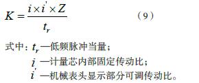 根據實際流量計的所測得儀表系數K 更換對應齒輪傳動比,使機械表頭顯示部分和齒輪轉動發(fā)出低頻脈沖輸出均與高頻脈沖輸出匹配,實際三者關系如下: