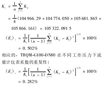 計算得出TBQM-G65-DN50在不同工作壓力下流量計儀表系數(shù)的重復性: