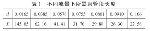 3.直管段長度和熱水計量表精度的初步預(yù)測在工程設(shè)計中,根據(jù)流體性質(zhì)、流量和雷諾數(shù)確定α和d值。這樣,按照式(5)就可以依不同的流量計精度要求,對直管段長度進行初步預(yù)測,或確定直管段長度后,對流量計的精度做初步預(yù)測。當(dāng)δ= 0.2%時,不同流量下所需直管段長度見表1。
