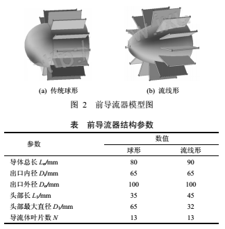 由于ρ和v為流體流動參數(shù),不能隨意增減,因此只能盡量減小壓損系數(shù)α,以達到降低壓損的目的。壓損系數(shù)除了受流體粘性、管徑及管長等因素影響外,與流量計內(nèi)部各部件的幾何結(jié)構(gòu)有密切關(guān)系。文獻通過試驗發(fā)現(xiàn)葉輪的形線、葉片數(shù)對壓力損失的影響較小(≤3%),因前導(dǎo)流器對流量計有著重要作用,故將傳統(tǒng)的球形前導(dǎo)流器改進為流線形,考察兩者在流動減阻方面的不同,進而分析對流量計性能的影響程度。DN100渦輪流量計改進前后的前導(dǎo)流器結(jié)構(gòu)如圖2所示,幾何參數(shù)見下表。
