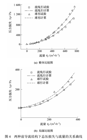 由圖4可知,兩種結(jié)構(gòu)下的計算與試驗值符合很好,誤差在全量程范圍內(nèi)均小于5%。在小流量(≤200 m³/h)區(qū),無論是計算值還是試驗值,兩種結(jié)構(gòu)的壓損值相差非常小,說明前導(dǎo)流結(jié)構(gòu)在流量較小時對壓損的影響不明顯。隨著流量的增大,結(jié)構(gòu)導(dǎo)致的壓力損失出現(xiàn)了較大差別,明顯看到,流線形與球形的數(shù)值差距越來越大,在*大流量處(約 750 m³/h),球形壓損比流線形增大約30%。