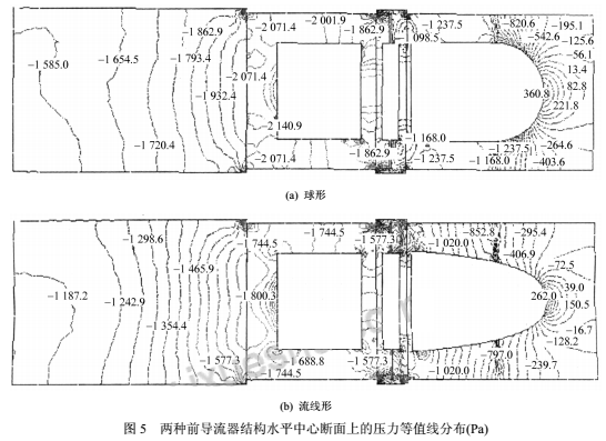圖5為兩種前導(dǎo)流器結(jié)構(gòu)水平中心斷面上的壓力等值線分布,宏觀上,圖5a、5b的壓力變化趨勢是一致的:在前導(dǎo)流器、葉輪和支架部分,壓力均不同程度地降低,由支架進入尾流區(qū)后,壓力逐步上升。