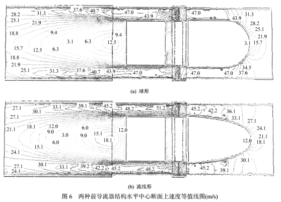 圖6為與圖5相同位置上的速度等值線分布。在前導(dǎo)流器處,可看出對應(yīng)壓力變化劇烈的區(qū)域,速度變化也較大。球形頭部速度急劇增大、直管段速度幾乎不變的分布趨勢使其中心出口速度(47.0m/s)較大(流線形45.2m/s),在同流量下表明球形前導(dǎo)流器具有較大速度梯度。當(dāng)氣流進入尾流部分后,由于流道突擴,在支架的背面形成明顯的低速渦區(qū),之后管壁附近速度降低,中心區(qū)主流速度回升,速度值被逐漸拉平,對應(yīng)壓力也逐步回升。可看到,至出口斷面,流線形的速度不均勻*大差值為6.0m/s,球形為9.4m/s,即球形的出口速度梯度更大,壓力回升則相應(yīng)較慢。