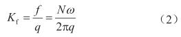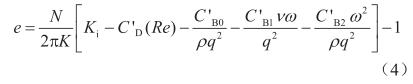 式中q表示體積流量,m3/s;ν表示介質(zhì)的運(yùn)動(dòng)黏度,m2/s;雷諾數(shù)Re=4q/(πdν);d表示流量計(jì)口徑,m;ρ表示介質(zhì)的密度,kg/m3;C'D、C'B0、C'B1和C'B2分別表示4個(gè)待定系數(shù),在某個(gè)流量點(diǎn)下標(biāo)定出的儀表系數(shù)(Kf,表示單位體積流體通過(guò)流量計(jì)時(shí),流量計(jì)輸出的脈沖數(shù),1/m3)和轉(zhuǎn)子葉片頻率(f,s-1)的關(guān)系為: