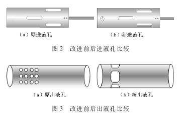 防砂卡防爆渦輪流量計結(jié)構(gòu)如圖1所示,主要由防爆渦輪流量計、篩狀出液孔、防爆渦輪流量計安裝短接、解卡管、解卡管開槽、中心管、長條孔(銷釘運動槽7)、薄壁筒、進液孔、解卡管固定銷釘、含水傳感器安裝筒組成。采用等效面法,將進液孔一分為二,改為寬2mm的矩形進液孔,解決從進液孔進入的長垢片或大垢片造成的砂卡,如圖2所示。將原先3個方型的出液孔改為直徑4mm的陣列狀的篩孔,解決儀器在下井過程中從出液孔進入儀器的長垢片、大垢片造成的砂卡,如圖3所示。