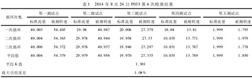 表1為2014年8月24日P033*6次校準(zhǔn)結(jié)果。本次校準(zhǔn)平均K值1.301r/(m3?s),大于1.0r/(m3?s),同時*大引用誤差為1.08%,小于*大允許誤差3%,啟動排量2m2/d時的平均轉(zhuǎn)速1.850r/s,因此P033校準(zhǔn)合格。同樣,P032、K001、K018先后校準(zhǔn)合格。因此,在啟動排量、*大允許誤差合格的前提下,K值大于等于1,K值可以評價解卡管、進液孔、出液孔造成的局部阻力損失。
