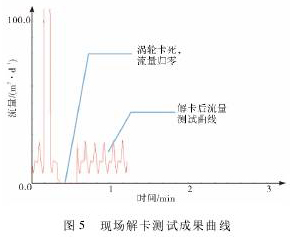 防砂卡防爆渦輪流量計在五大隊成功解卡370井次,現(xiàn)場解卡測試曲線見圖5。剛測試時,渦輪葉片轉(zhuǎn)動正常,大約在20s左右,由于流體帶進的雜質(zhì)導(dǎo)致流量曲線歸零。通過儀器二芯供電收傘,大約15s后再開傘,一芯流量供電測試,渦輪葉片通過瞬間開收傘,擴大了葉輪與渦輪殼體之間的空間,雜質(zhì)通過渦輪葉片旋轉(zhuǎn)正常。從曲線可以看出,在解卡前和解卡后,渦輪旋轉(zhuǎn)--致,都為15m3/d左右,而且解卡前后沖次一致,防爆渦輪流量計解卡裝置有效解決了因油井出砂、垢片、間隙小造成的砂卡,砂卡率由原先的70%降低到30%,實現(xiàn)了產(chǎn)液剖面流量準(zhǔn)確測試。