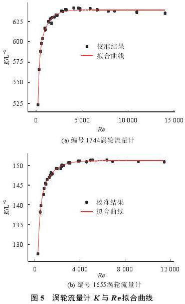 利用雙指數衰減函數對儀表系數與雷諾數關系進行擬合,在層流范圍內(Re<2300),儀表系數隨Re增加迅速增加,尤其是在Re<1000范圍內更加明顯;而在Re>3000紊流范圍內,儀表系數變化平緩,接近常數;在10003000的穩(wěn)定儀表系數。