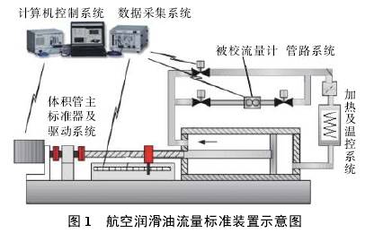 圖1是航空潤滑油流量校準裝置示意圖。裝置采用伺服電機驅動標準計量油缸的結構形式,主要由計量油缸、電機及控制器、滾珠絲杠、直線導軌、校準管路、切換閥門、油箱、控溫機組、溫度壓力傳感器、精密光柵尺、數據采集系統(tǒng)、控制計算機等部件構成。裝置采用伺服電機驅動標準計量油缸產生標準流量源,計量油缸同時作為容積標準,與光柵配合構成流量測量系統(tǒng)。校準裝置通過調節(jié)控制介質溫度而改變介質粘度。標準裝置技術指標為:流量范圍:0.5~160L/min;擴展不確定度:0.05%(k=2);溫度范圍:20~120℃。