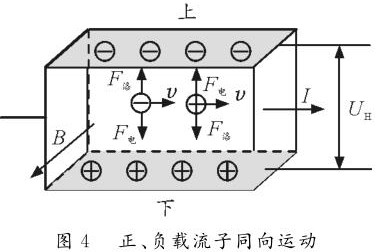反之,如圖2所示,若載流子帶負(fù)電荷,則載流子在洛倫茲力作用下會(huì)向下偏轉(zhuǎn),導(dǎo)體下表面積累負(fù)電荷。同時(shí),上表面失去負(fù)電荷而帶上正電,從而使上表面電勢(shì)高于下表面。