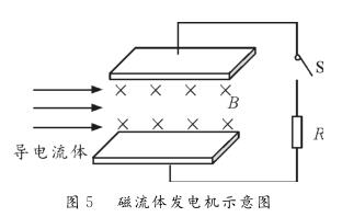 【例1】圖5為磁流體發(fā)電機(jī)示意圖。設(shè)兩金屬板間的距離為d,兩*板間勻強(qiáng)磁場(chǎng)的磁感應(yīng)強(qiáng)度為B。等離子體垂直進(jìn)入磁場(chǎng)的速度為v,單個(gè)離子所帶的電荷量為q。離子通道(即兩*板內(nèi)所圍成的空間)的等效電阻為r,負(fù)載電阻為R。則下列判斷正確的是( ?。?br /> A。該發(fā)電機(jī)的電動(dòng)勢(shì)E=Bdv