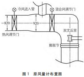 從流量測(cè)量角度講,影響流場(chǎng)的主要為熱風(fēng)調(diào)門、擴(kuò)管、彎頭以及一次冷風(fēng)的混入,閘板門和混合風(fēng)調(diào)門由于運(yùn)行時(shí)處于全開狀態(tài),影響可忽略,目前使用了單點(diǎn)雙文丘里管的測(cè)量方式,有以下問題: