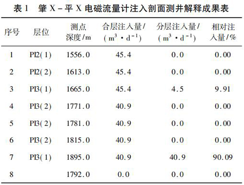 2017 年 9 月在大慶油田采油八廠肇 X - 平 X 水平井注水井中*次進行了水平井注入剖面測井現(xiàn)場試驗。該井斜深2 055. 42 m,水平段長度為568. 46 m,試驗?zāi)康氖峭ㄟ^注入剖面測井了解該井各層段的注水情況,同時對水平井測井工藝、儀器的適用性、井下牽引器及井口輔助裝置等設(shè)備的工作有效性和可靠性進行評價。現(xiàn)場試驗中,在密閉條件下錄取到了該井的注入剖面測井資料,進行了重復(fù)測量,重復(fù)測量結(jié)果在誤差允許范圍內(nèi),測井成果見表 1。該井施工壓力 6. 0 MPa,注入量45. 4 m3 /d,有 7 個射孔層,分 8 個測點測量,2 個層有吸入顯示,其中,P13( 1) ( 1 734 ~ 1 767 m) 層絕對吸入量4. 5 m3 /d,相對吸入量為9. 91 %,P13( 1) ( 1 899 ~1 943 m)層絕對吸入量 40. 9 m3 /d,相對吸入量為 90. 09% ,測井成果見表 1。通過與甲方的交流,再結(jié)合該井的動靜態(tài)資料及周圍井的工作狀況,采油廠的地質(zhì)人員認(rèn)為本次測井結(jié)果能比較準(zhǔn)確地反映該井的注入情況。