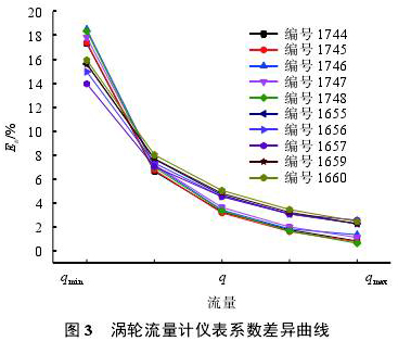 由圖2可知,不同粘度點下流量計儀表系數(shù)差異很大,圖3是10支流量計各流量點儀表系數(shù)誤差曲線。儀表系數(shù)差異通過式(1)計算。結果顯示,在低流量點儀表系數(shù)*大相差18%以上,在高流量點儀表系數(shù)*小相差約1%。