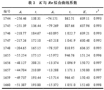 利用雙指數(shù)衰減函數(shù)對儀表系數(shù)與雷諾數(shù)關系進行擬合,在層流范圍內(Re<2300),儀表系數(shù)隨Re增加迅速增加,尤其是在Re<1000范圍內更加明顯;而在Re>3000紊流范圍內,儀表系數(shù)變化平緩,接近常數(shù);在1000