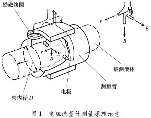 純化水流量表的測量原理如圖 1 所示。根據(jù)法拉*電磁感應定律,導電液體在磁場中流動會產(chǎn)生電動勢 E,它與磁感應強度 B、導電液體平均流速 v 成一定比例關系: