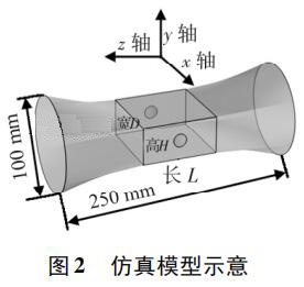 使用 Pro /E 軟件建立三維幾何模型,導(dǎo)入 COMSOL 軟件進(jìn)行有限元求解。仿真模型如圖 2 所示,電*連線(xiàn)為x 軸,連線(xiàn)中點(diǎn)為坐標(biāo)原點(diǎn),流體運(yùn)動(dòng)方向?yàn)?z 軸,傳感器管道口徑為 DN100,總長(zhǎng)250 mm。異徑管部分初始結(jié)構(gòu)尺寸 L = 80 mm,D = 80 mm,H = 40 mm,圓形電*半徑為17 mm,伸出絕緣襯里的*大距離為 1. 5 mm。
