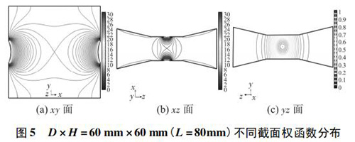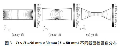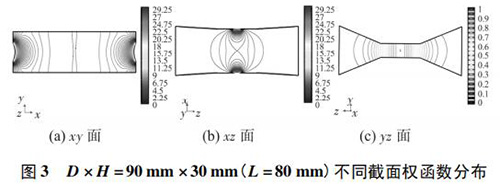 4) 圖 3( c) 、圖 4( c) 的 yz 面權(quán)函數(shù)分布表明,D = 90 mm時(shí)的權(quán)函數(shù)等勢(shì)線(xiàn)間距略大于 D = 60 mm 時(shí)的權(quán)函數(shù)等勢(shì)線(xiàn)間距,權(quán)函數(shù)變化梯度較小,且中心區(qū)域的權(quán)函數(shù)等勢(shì)線(xiàn)逐漸變?yōu)橹本€(xiàn),因此 D = 90 mm 的權(quán)函數(shù)分布更均勻一些,但是兩者區(qū)別很小,即寬度改變對(duì) yz 面權(quán)函數(shù)分布影響很小。圖 4( c) 、圖 5( c) 的 yz 面權(quán)函數(shù)分布表明,H = 30 mm時(shí)的權(quán)函數(shù)等勢(shì)線(xiàn)間距較大,且中心區(qū)域的權(quán)函數(shù)等勢(shì)線(xiàn)逐漸變?yōu)橹本€(xiàn),因此 H = 30 mm 的權(quán)函數(shù)分布更加均勻;