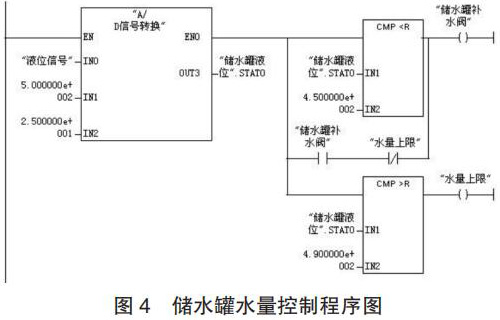 (2)程序設(shè)計。儲水罐水量控制的工作過程為:當(dāng)壓力變送器檢測到儲水罐的水量低于 450kg 時,補水閥 3 開啟為儲水罐補水;當(dāng)水量達(dá)到 490kg 時,補水閥 3 關(guān)閉;生產(chǎn)配制過程中,循環(huán)以上控制過程。儲水罐水量控制的程序如圖 4 所示。