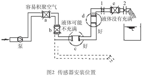 液體流動(dòng)方向必須與傳感器殼體上箭頭方向一致。對(duì)于能正反向測(cè)量的冷卻水流量計(jì),若方向不一致雖仍可測(cè)量,但設(shè)定的顯示流動(dòng)正反方向不符,必須改正之。若拆傳感器工作量大,也可改變傳感器上箭頭方向和重新設(shè)定顯示儀表符號(hào)。管道未充滿液體主要是管網(wǎng)工程設(shè)計(jì)或傳感器安裝位置不妥,使傳感器測(cè)量管內(nèi)不能充滿液體。應(yīng)采取措施,避免安裝如圖2所示a,e位置和以虛線管排放時(shí)b位置,改裝到c,d位置。