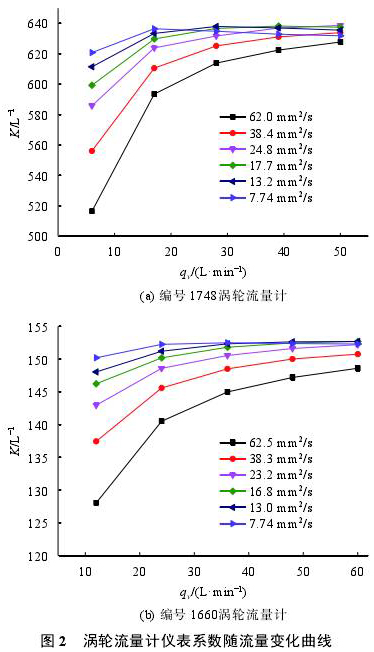 研究利用航空潤(rùn)滑油流量標(biāo)準(zhǔn)裝置在20,30,40,50,60,80℃對(duì)10支甲醇流量計(jì)進(jìn)行校準(zhǔn)試驗(yàn)。CL-10型流量計(jì)校準(zhǔn)流量點(diǎn)分別為6,17,28,39,50L/min;CL-15型流量計(jì)校準(zhǔn)流量點(diǎn)分別為12,24,36,48,60L/min。圖2是1748和1660兩支甲醇流量計(jì)在各粘度點(diǎn)儀表系數(shù)隨流量變化曲線。