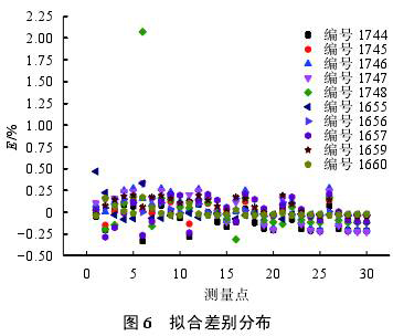 選取與以上要求的9個(gè)關(guān)鍵雷諾數(shù)相近的流量點(diǎn)數(shù)據(jù)進(jìn)行擬合,并與全數(shù)據(jù)擬合結(jié)果進(jìn)行比較,兩者差別通過(guò)式(9)進(jìn)行評(píng)估。圖6是兩種擬合方式差別分布情況。300對(duì)數(shù)據(jù)點(diǎn)中,僅有1點(diǎn)儀表系數(shù)差別超過(guò)2%,其他各點(diǎn)差別均小于0.5%,而且99%以上的數(shù)據(jù)點(diǎn)差別小于±0.33%,86%以上的數(shù)據(jù)點(diǎn)差別小于±0.20%。
