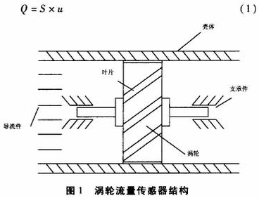 渦輪流量傳感器結(jié)構(gòu)如圖1所示,屬于速度式流量傳感器。渦輪置于流體通道中,隨著流體的流動(dòng)產(chǎn)生旋轉(zhuǎn),設(shè)渦輪的轉(zhuǎn)速為n、流過(guò)渦輪的流體速度為u,則n與u成正比;流體通道的流通截面.積S是已知的常數(shù),所以,流過(guò)渦輪流量傳感器的流體體積流量Q為: