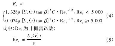 式中:Cl和Cd為葉柵的升力系數(shù)和阻力系數(shù),二者可通過(guò)不可壓縮勢(shì)流的方法計(jì)算,與葉片翼型、葉輪轉(zhuǎn)速、來(lái)流速度和半徑位置等參數(shù)相關(guān)。