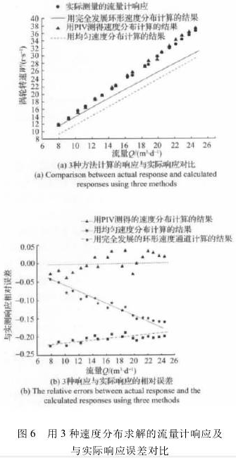 分別計(jì)算各個(gè)響應(yīng)在不同流量點(diǎn)處與真實(shí)響應(yīng)的相對(duì)誤差,結(jié)果如圖6(b)所示。從圖中可以明顯看出,用PIV獲得的速度分布計(jì)算的結(jié)果與實(shí)際響應(yīng)的相對(duì)誤差*小,在3%以內(nèi);用均勻入口速度分布計(jì)算的結(jié)果誤差*大;用完全發(fā)展的環(huán)形通道速度分布當(dāng)雷諾數(shù)超過(guò)2000時(shí),由于計(jì)算模型假設(shè)由層流的速度分布直接轉(zhuǎn)變?yōu)橥牧鞯乃俣确植寄P?,未能合理地反映?shí)際流動(dòng)中逐步轉(zhuǎn)變的過(guò)渡階段,導(dǎo)致理論結(jié)果與實(shí)際速度分布有較大差異,所以誤差較大。通過(guò)這些對(duì)比不難看出,獲得真實(shí)的速度分布能更為準(zhǔn)確地計(jì)算柴油計(jì)量表的實(shí)際響應(yīng)。面對(duì)復(fù)雜的上游來(lái)流條件,PIV結(jié)果更能反映柴油計(jì)量表內(nèi)部流動(dòng)的主要特征,這也從另一個(gè)側(cè)面表明,對(duì)柴油計(jì)量表內(nèi)部復(fù)雜流動(dòng)的精細(xì)測(cè)量和深入認(rèn)識(shí)也將是完善相關(guān)理論和進(jìn)一步優(yōu)化其性能的重要途徑。