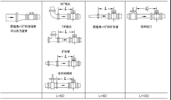 得出圖3的流速曲線有一個(gè)前提條件,就是保證流量計(jì)前后直管段的要求。為了使流過傳感器介質(zhì)流態(tài)穩(wěn)定,測量精度不受流速分布影響,通常對流量計(jì)直管段長度要求上游10D、下游5D(D為電磁流量計(jì)口徑),如圖4所示。直管段是從污泥流量計(jì)傳感器中點(diǎn)算起,并是不很多人以為的法蘭連接處算起。
