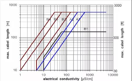 以某品*污泥流量計(jì)選型樣本提供的電導(dǎo)率和電纜長度曲線為例,其中A型電纜為雙芯雙屏蔽DS300、B型電纜為雙芯三屏蔽BTS300。像浙江省一般水庫原水電導(dǎo)率在100us/cm左右,安裝所需電纜線小于100米,選A型即可,超過100米,需要選B型。