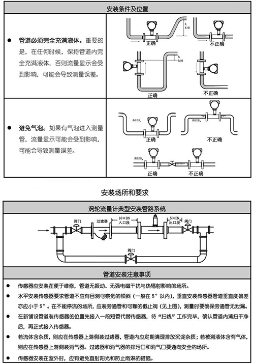 渦輪流量傳感器可水平、垂直安裝,垂時流體方向必須向上。液體應充滿管道,不得有氣泡。安裝時,液體流動方向應與傳感器外殼上指示流向的箭頭方向一致。直管段內(nèi)壁應光滑清潔,無凹痕、積垢和起皮等缺陷。