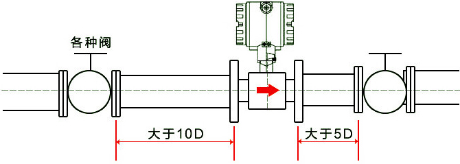 2、安裝時液體流動方向應(yīng)與傳感器外殼上指示流向的箭頭方向一致,且上游直管段應(yīng)≥20dn,下游直管段應(yīng)≥5dn(dn為管道內(nèi)徑)。