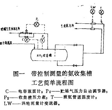 衛(wèi)生型液體渦輪流量計(jì)安裝在氨收集槽液氨管道上,帶控制測(cè)量的氨收集槽工藝簡(jiǎn)單流程是:當(dāng)320kg/cm2液氨送入收集槽,降壓到16kg/cm2,氨在收集槽內(nèi)進(jìn)行氣液相分離,分離后的貯罐氣送出管路,分離后的液氨,經(jīng)液氨管道送到液氨倉庫(如‘圖一所示)