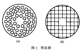 圖2為圓孔和方孔兩種形狀整流柵,整流柵直徑為100mm,寬為15mm。方孔流通面積約為圓孔流通面積的4/3。中間實(shí)體為固定整流柵螺釘位置。