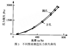 圖3是只改變整流柵條件下,流體經(jīng)過流量計(jì)的壓力損失曲線。由圖知,盡管方孔整流柵比圓孔增大了萬方數(shù)據(jù)的通流面積,但對(duì)流體壓損的影響并不明顯。在小于300m³/h的范圍內(nèi),兩者幾乎沒有差別,在Q=700m³/h處,方孔整流柵*大使壓損降低300Pa,比圓孔整流柵改善約10%,在工作范圍60~600m³/h內(nèi),方孔比圓孔平均改進(jìn)約2%,但方孔加工難度大于圓孔,因此,應(yīng)根據(jù)實(shí)際情況選擇整流柵。