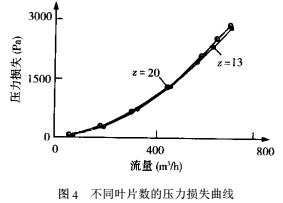 本文在允許范圍內(nèi)分別選擇13和20個(gè)葉片數(shù)的葉輪進(jìn)行了測(cè)量,結(jié)果如圖4所示??煽吹剑瑑蓷l曲線幾乎重合。說明在允許范圍內(nèi),葉輪葉片數(shù)的增減對(duì)壓力損失的影響可以忽略。但采用13葉片數(shù)的葉輪時(shí),測(cè)得流量計(jì)起始流量為6.5m³/h,而采用20葉片數(shù)的葉輪,其起始流量為5.5m³/h,適當(dāng)增加葉片數(shù),可以較明顯地提高流量計(jì)的靈敏度。值得注意的是,增加葉片數(shù)會(huì)使重疊度增大,過大的重疊度將使流量計(jì)性能惡化。