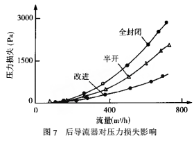 圖7為分別采用三種后導(dǎo)流器而其余部件不變條件下流量計(jì)的壓力損失曲線。由圖可知,在流量為0~100m³/h范圍內(nèi),三種結(jié)構(gòu)的壓力損失均很小,可以認(rèn)為壓力損失在小流量工況下對(duì)幾何結(jié)構(gòu)不敏感,即后導(dǎo)流器的幾何形狀變化還沒有對(duì)壓損產(chǎn)生影響。隨著流量的增大,三條曲線明顯拉開了距離,其中全封閉式壓損增長*快,半開式次之,壓損*小的是改進(jìn)式,在額定*大流量600m³/h處,改進(jìn)式壓損僅為700Pa,約為半開式壓損的1/2,為全封閉式壓損的1/3。當(dāng)流量進(jìn)一步增大,這種差距還將隨之增加。由此可見,選擇合適的導(dǎo)流器可以大大降低流量計(jì)的壓力損失。在流量計(jì)的工程應(yīng)用中,有必要對(duì)前、后導(dǎo)流器幾何參數(shù)進(jìn)行優(yōu)化,以達(dá)到*小壓損目的。