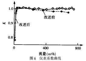 由圖8可看出,采用改進(jìn)的后導(dǎo)流器后,流量計(jì)儀表系數(shù)比改進(jìn)前有較好的改善,在量程范圍內(nèi)(60~600m³/h),K很好地體現(xiàn)了系數(shù)的特性,甚至在超過*大量程后,能繼續(xù)保持水平直線狀態(tài)。改進(jìn)前的流量計(jì)K值也較好,但隨著流量增大,直線略向下傾斜,偏離了水平位置。