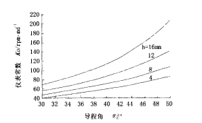 (2)可見,對確定的渦輪流量傳感器,易知口徑D大,K。值??;葉片數(shù)n大,K。值大等。如果要獲得較大的儀表常數(shù),就一要對渦輪傳感器的結(jié)構(gòu)參數(shù)進(jìn)行優(yōu)化設(shè)計,從圖(2)可以看出,葉片高度h增加,K。增大;導(dǎo)程角增大,K。增大。對于φ19的過環(huán)空大排量渦輪流量計而言,由上式計算得K。=74.567rpm/m³/d,而水中標(biāo)定的Kw=78.89rpm/m³/d,表1給出不同口徑和不同導(dǎo)程角下渦輪流量計固有儀表常數(shù)的計算值。