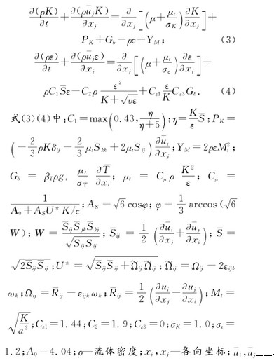 各向流速平均值;a—聲速;μ—動力粘性系數(shù);υ—運動粘性系數(shù);K—湍流動能;ε—湍流耗散率;βT—膨脹系數(shù);ωk—角速度;—時均轉(zhuǎn)動速率張量;如不考慮浮力影響Gb=0,如流動不可壓縮,=0,YM=0。